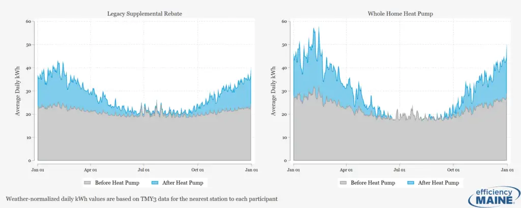Finally, results were benchmarked against findings from Maine’s earlier legacy supplemental heat pump rebate program, which did not require heat pump systems to be the primary heating source. (The new program design requires that the heat pump system meet at least 80% of a home’s peak heating load). This comparison made it possible to isolate the impact of the program design change.