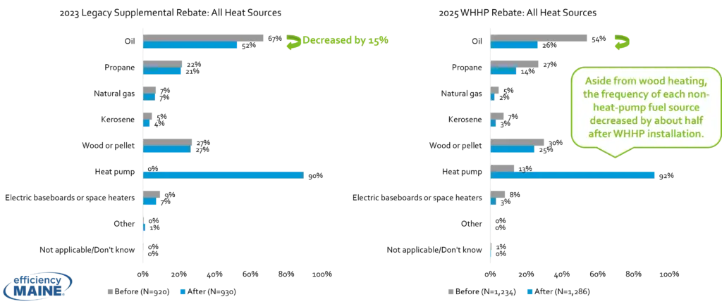 Both metered data and survey responses show that WHHP program participants rely on heat pumps far more frequently than participants in the legacy supplemental program on typical winter days and during very cold conditions. Reported use of oil, propane, and other fossil fuels declined sharply after installation.