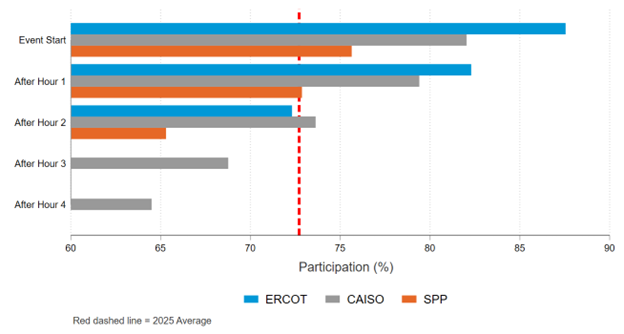 A key finding is that GR performance scales with temperature (which is often high in the case of grid stress). The July 30 ERCOT event at 94.4 degrees Fahrenheit achieved the highest per-device impact at 1.26 kW, while the September 25 ERCOT event at 79.6 degrees Fahrenheit produced the lowest at 0.58 kW. This alignment between resource capability and grid needs is precisely what operators look for in a critical capability resource. It delivers when conditions are highly stressed.